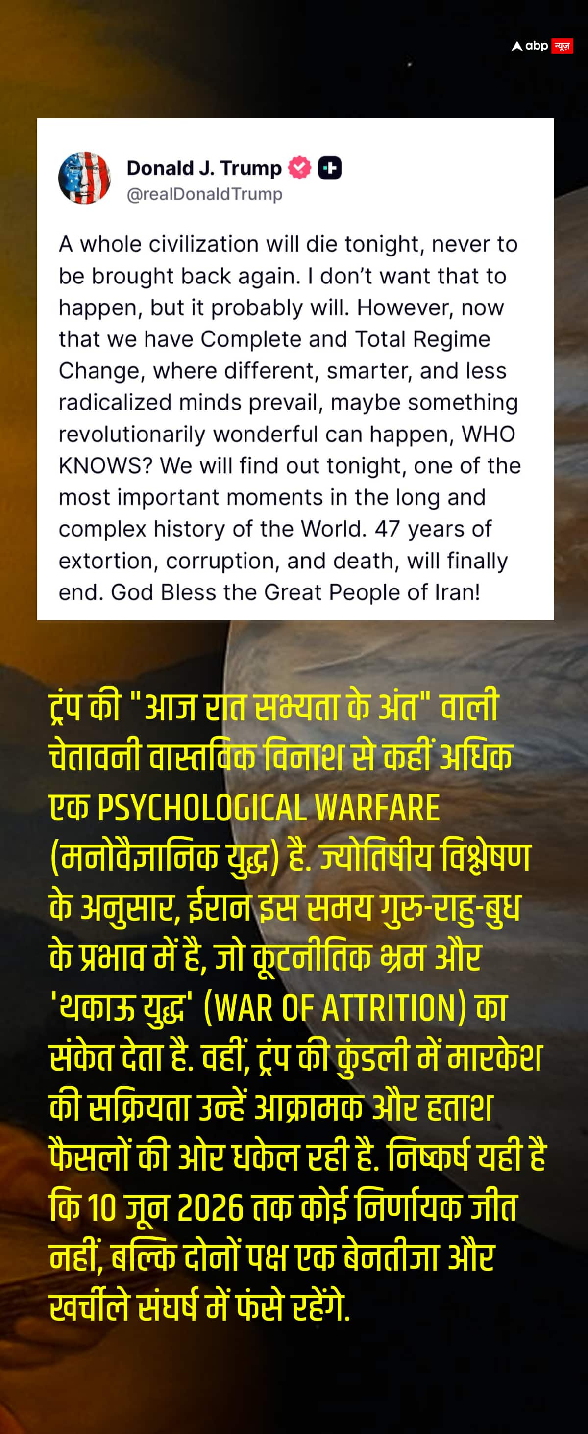 ज्योतिषीय और कूटनीतिक विश्लेषण का निचोड़ यही है कि कोई सर्वनाश नहीं, आज रात कोई सभ्यता खत्म नहीं होगी. इसे एक मनोवैज्ञानिक युद्ध की तरह लेना चाहिए, ट्रंप का बयान केवल 'डर पैदा कर झुकाने' की राहु-बुध वाली रणनीति है.